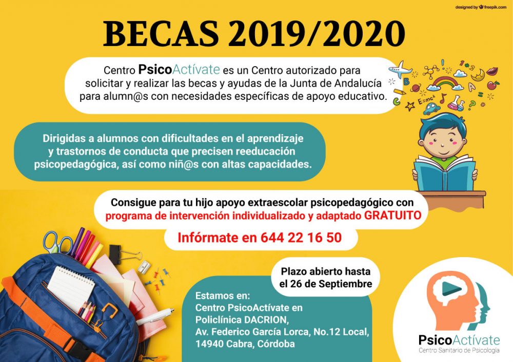 PsicoActívate es un Centro de Psicología localizado en Cabra, estamos autorizados para solicitar y realizar las becas y ayudas de la Junta de Andalucía para alumn@s con necesidades específicas de apoyo educativo.
