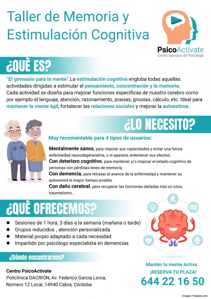 Taller de memoria y estimulación cognitiva en Cabra especializado para nuestros mayores impartido por Psicólogo Sanitario especializado en demencias y deterioro cognitivo. Ideal para mantener la mente activa tras la jubilación y para prevenir o ralentizar cualquier tipo de demencia o deterioro cognitivo leve.